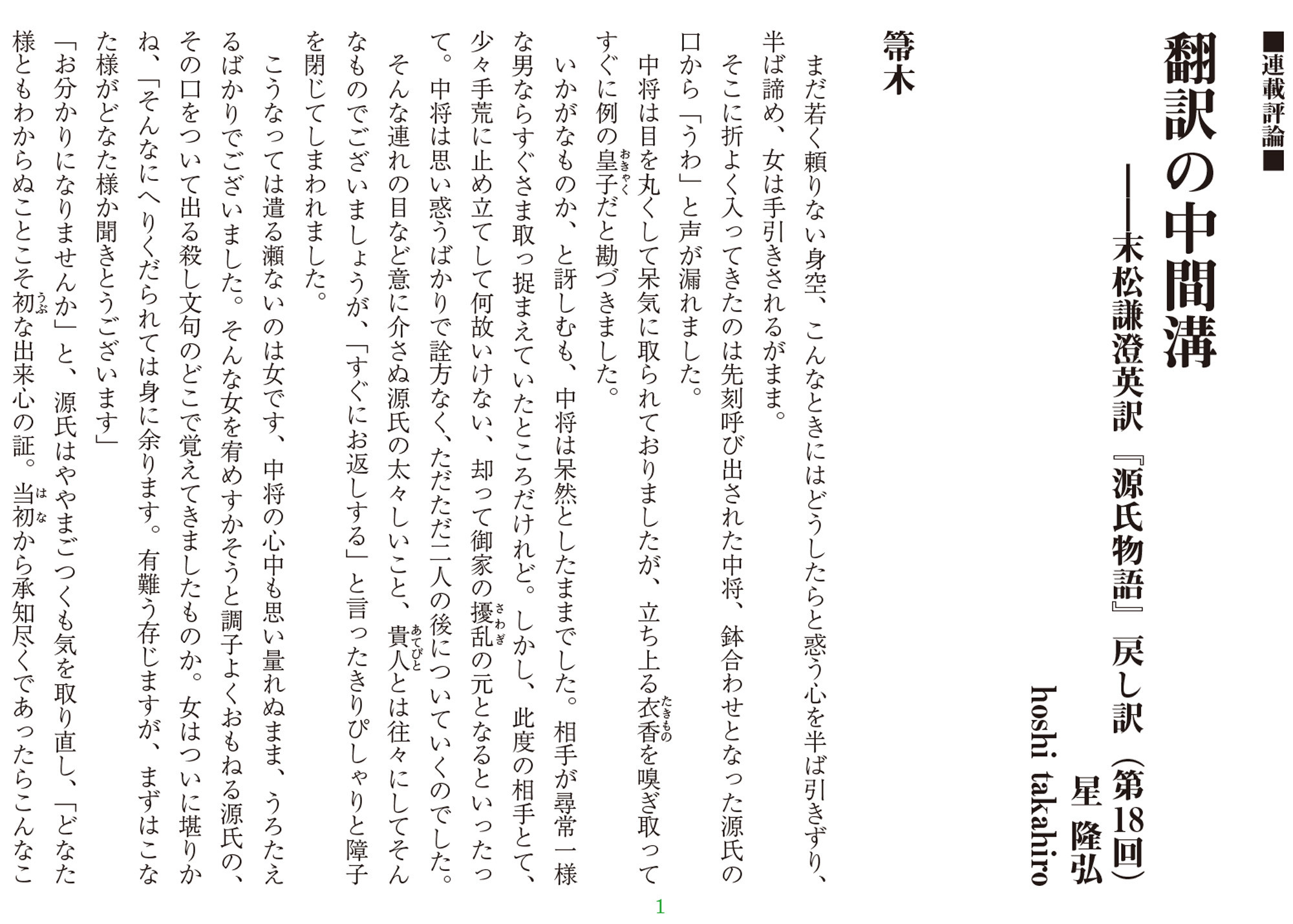 日本文学の古典中の古典、小説文学の不動の古典は紫式部の『源氏物語』。現在に至るまで欧米人による各種英訳が出版されているが、世界初の英訳は明治15年(1882年)刊の日本人・末松謙澄の手によるもの。欧米文化が怒濤のように流入していた時代に末松はどのような翻訳を行ったのか。気鋭の英文学者・星隆弘が、末松版『源氏物語』英訳の戻し訳によって当時の文化状況と日本文学と英語文化の差異に迫る! by 金魚屋編集部 横書きでもお読みいただけます。左のボタンをクリックしてファイルを表示させてください。 ■ 金魚屋 BOOK SHOP ■ ■ 金魚屋 BOOK Café ■ 星隆弘 連載評論『翻訳の中間溝――末松謙澄英訳『源氏物語』戻し訳』(第18回)【V】 was last modified: 10月 11th, 2025 by 星隆弘 関連記事 星隆弘 連載評... 萩野篤人 連載... 萩野篤人 連載... 星隆弘 連載評... 星隆弘 連載評... 萩野篤人 連載... 萩野篤人 連載... 星隆弘 連載評... 星隆弘 連載評... 萩野篤人 連載...