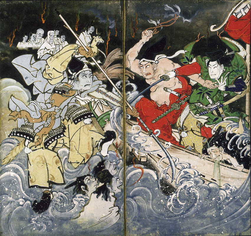図録解説によると『船弁慶』は同名の謡曲を絵にしたものである。右から源義経、数珠を持つ弁慶、空から海から湧きあがる幽鬼を引き連れ薙刀で襲いかかって来るのが壇ノ浦で入水した平知盛の怨霊である。絵金は歌舞伎だけでなく人々がよく知っている人気の謡曲も絵画化している。
