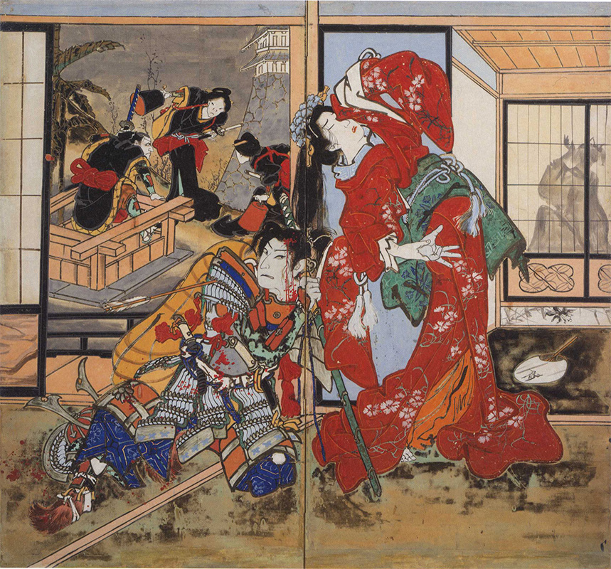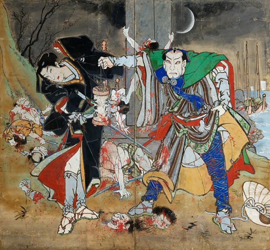 板木の原本を作るより一点物の絵を描く方が浮世絵師の報酬が高かったのはよく知られている。絵金の芝居絵屏風は紙本で高価な絹本はないが、絵具を大量に使う肉筆でしかも巨大だから画料はそれなりに高かったはずだ。土佐沿岸部の商人たちは海運業で裕福だったから絵金に多くの芝居絵屏風を注文することができたのである。しかしなぜ人の背丈ほどもある二曲一隻の屏風なのか。