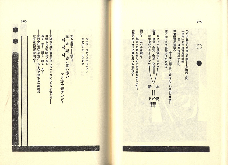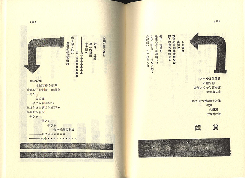 未来派のイメージは機械ですが『死刑宣告』のイラストは直線と曲線を多用したまさに機械的なもの。文字を人の顔や動物、物の形にレイアウトするアポリネールのカリグラムなども使っている。自由詩は形式・内容面で文字通り一切制約がない言語表現ですが『死刑宣告』はそれを呆れるほどの大胆さで表現した。後に北園克衛や春山行夫がタイポグラフィを始めますがその思いきりのよさ、大胆さで『死刑宣告』には及ばない。こういったムチャな詩集を作ったのは川端隆之さんの『古霊』(昭和六十一年[一九八一年])と『MIXED MEDIA』(平成三年[九一年])くらいじゃないかな。僕は自分じゃこういった詩集は作を作ろうと思わないですが自由詩ならではの詩集です。