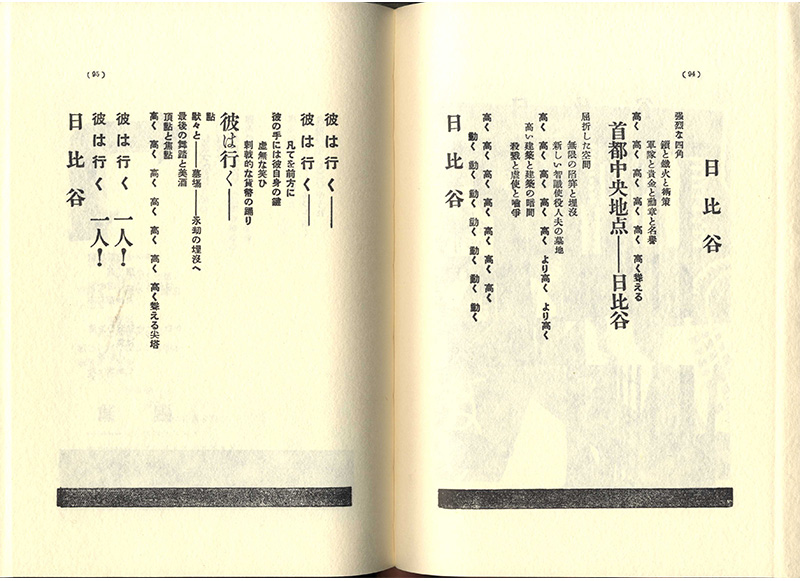 詩篇「日比谷」、「無題」も同様です。「日比谷」は当時の日本の中心=「首都中央地点」を指しますがそれを横目に「彼は行く」「黙々と――墓場――永劫の埋没へ」と詠っている。単独者のアナキストらしい詩です。「無題」は一種の疾走詩篇。詩の最初の方に「俺は餓ゑた」とありその飢餓意識から疾走が始まる。問題が何かわからないまま、どう解決していいのかわからないまま走り出さずにはいられない焦燥感です。それが文字通り太い矢印を使って表現されている。