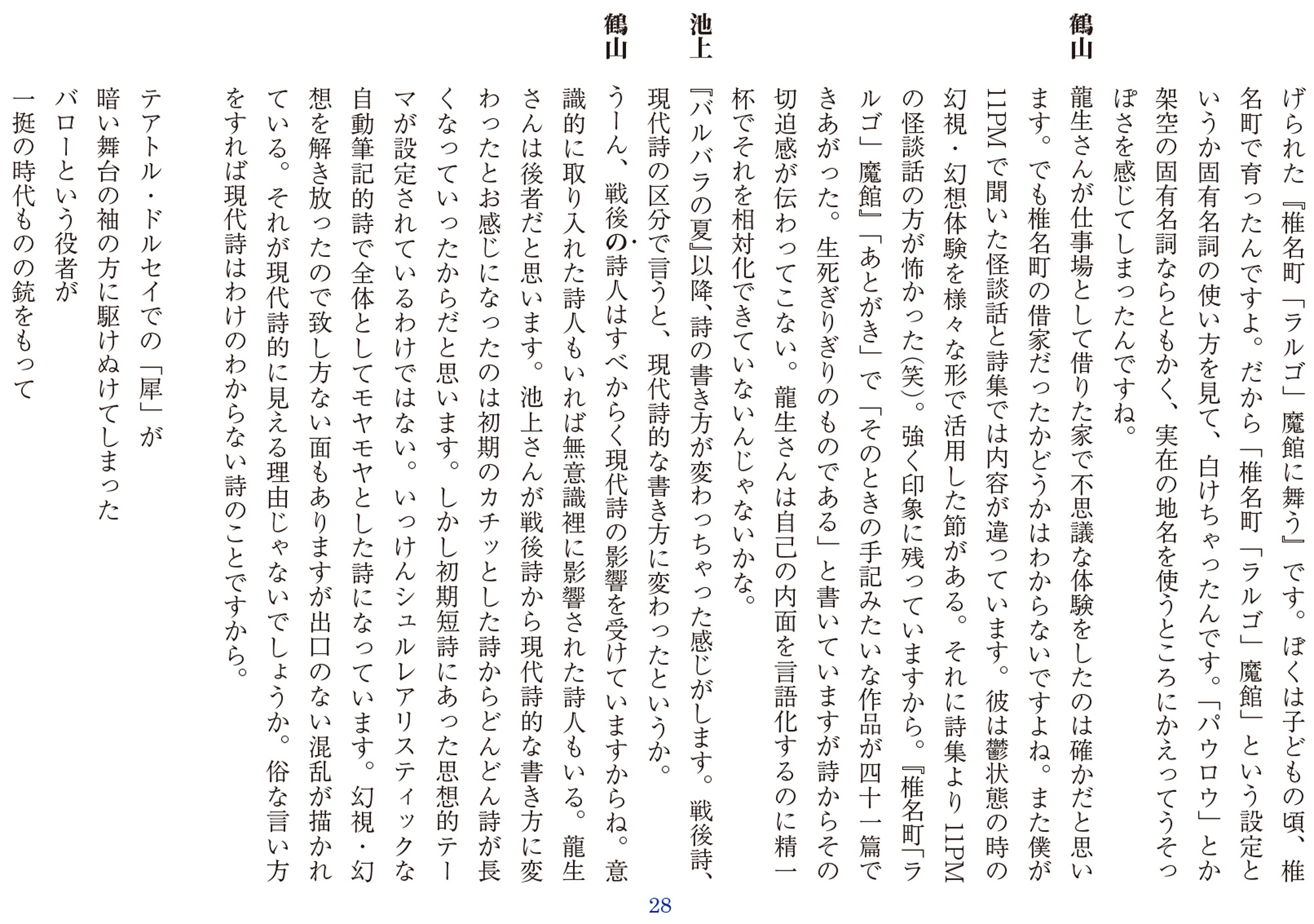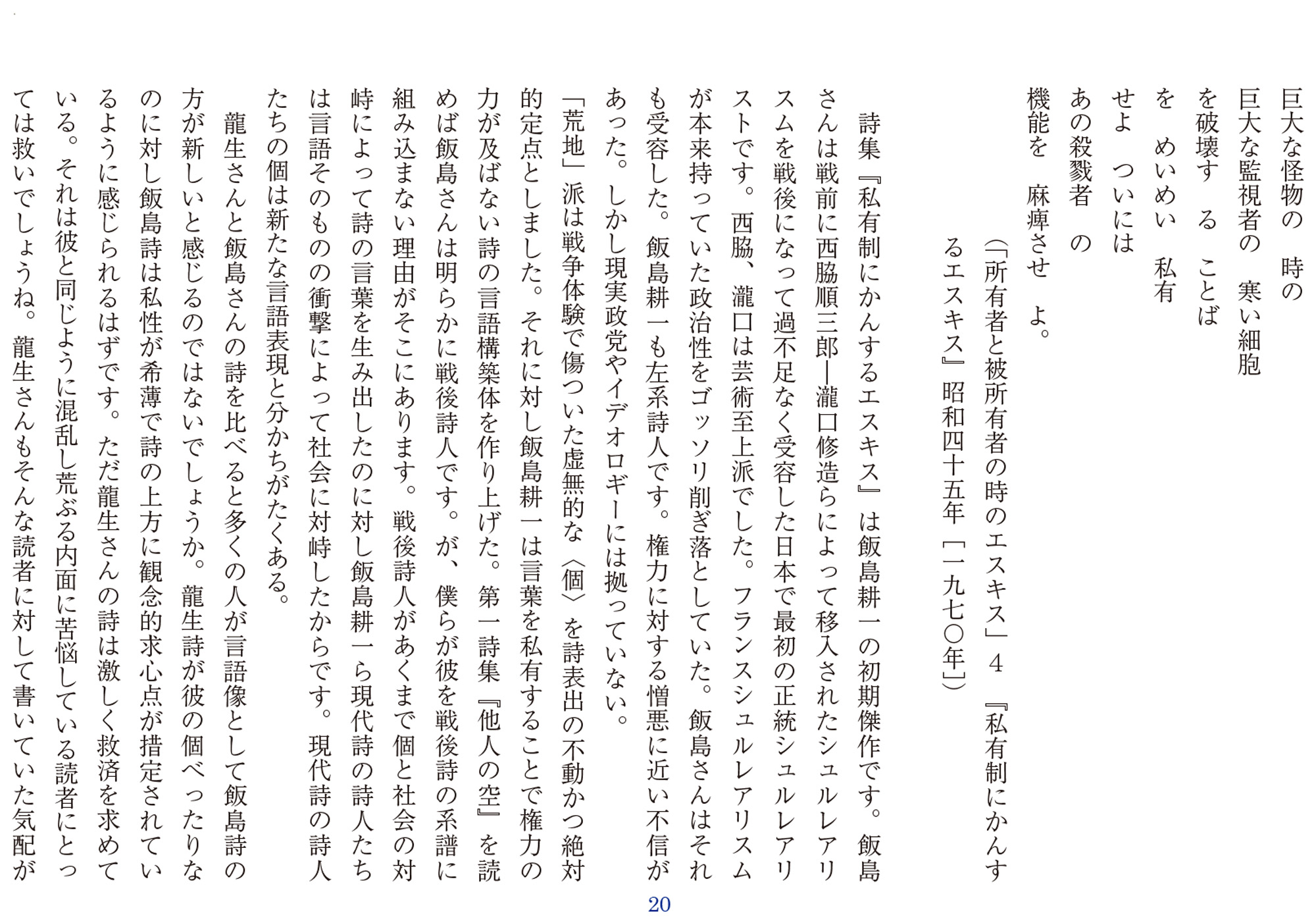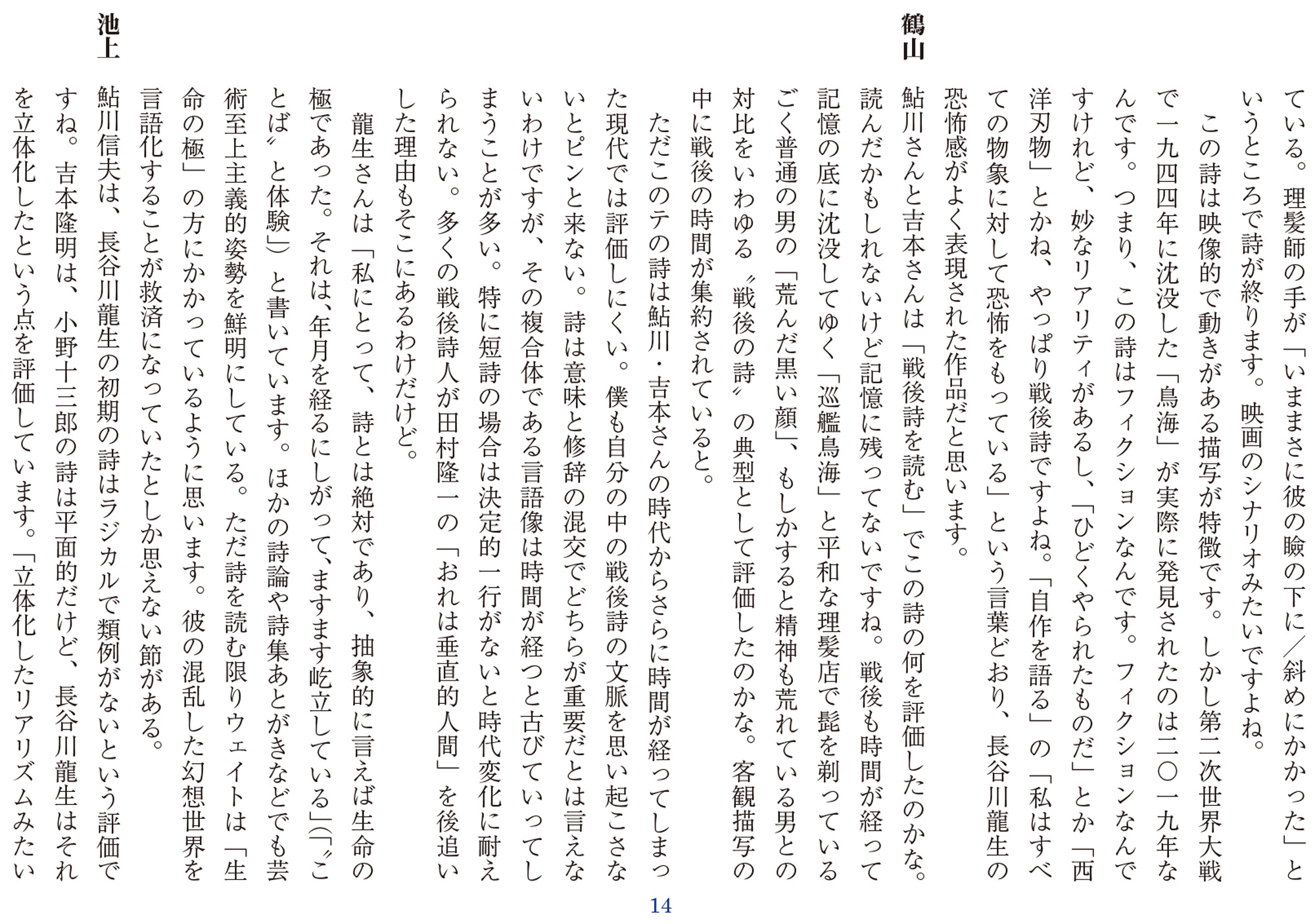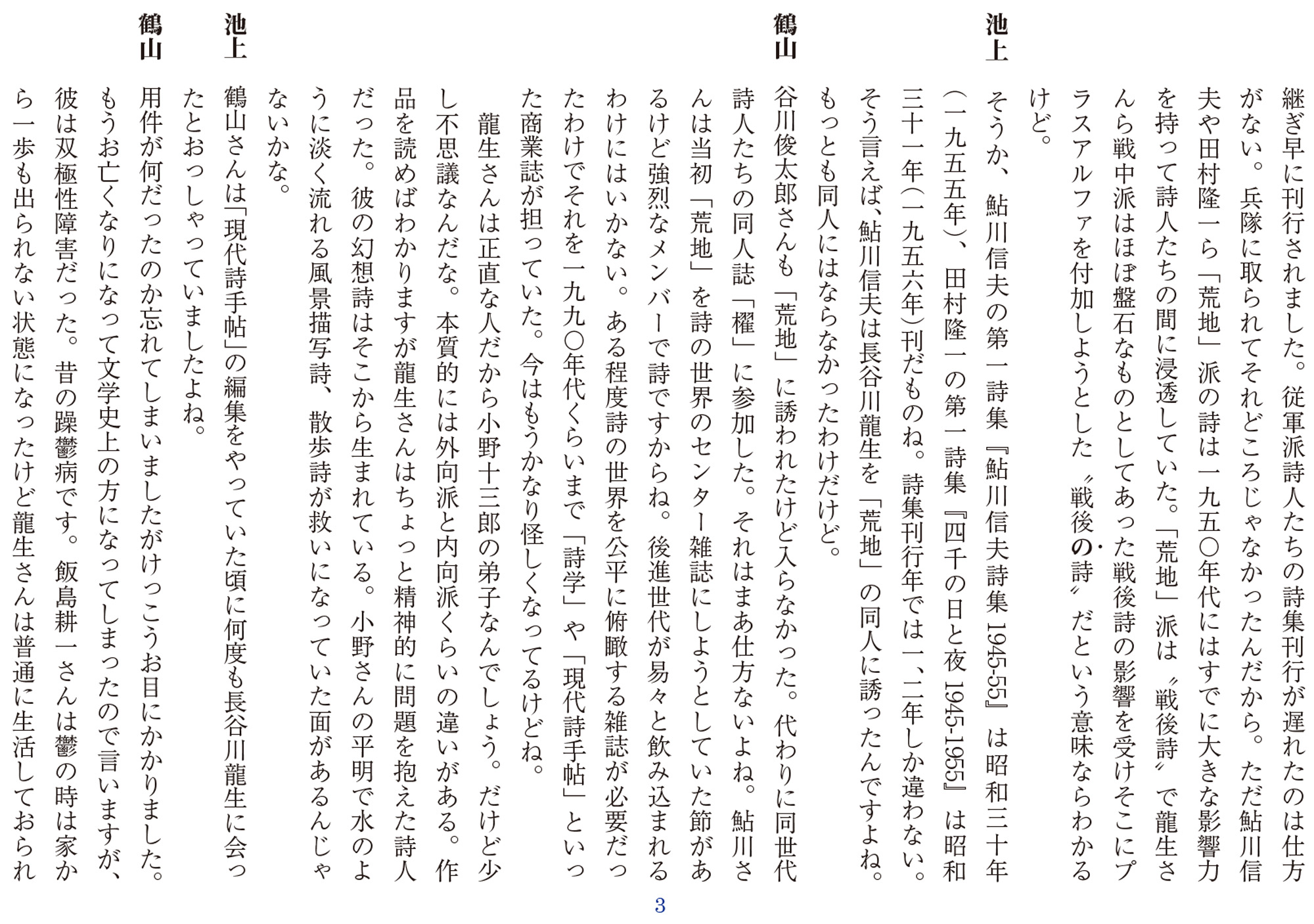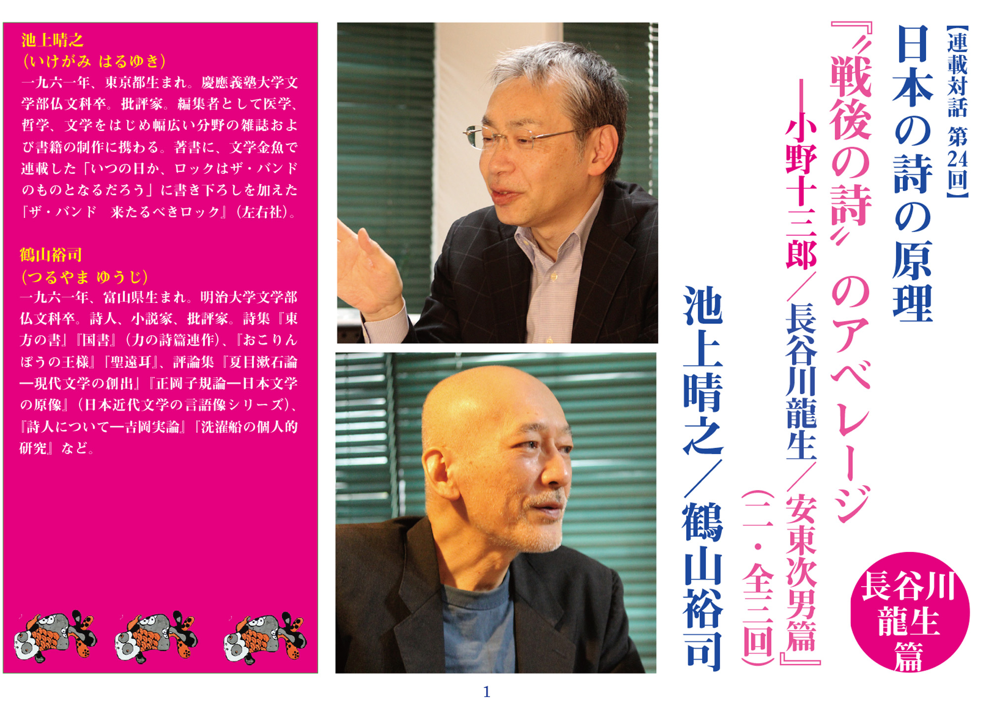 自由詩は現代詩以降の新たな詩のヴィジョンを見出せずに苦しんでいる。その大きな理由の一つは20世紀詩の2大潮流である戦後詩、現代詩の総括が十全に行われなかったことにある。21世紀自由詩の確実な基盤作りのために、池上晴之と鶴山裕司が自由詩という枠にとらわれず、詩表現の大局から一方の極である戦後詩を詩人ごとに詳細に読み解く。 by 金魚屋編集部 横書きでもお読みいただけます。左のボタンをクリックしてファイルを表示させてください。 *『対話 日本の詩の原理』は毎月01か02日にアップされます。 ■『ザ・バンド 来たるべきロック』池上晴之著 ■ ■鶴山裕司さんのコンテンツ■ 連作詩『聖遠耳 日日新』 連載詩論『現代詩人論』 連載『安井浩司研究』 連載評論『高柳重信とその時代』 連載エッセイ『言葉と骨董』 連載時評『美術展時評』 句誌時評 歌誌時評 ■ 金魚屋 BOOK SHOP ■ ■ 金魚屋 BOOK Café ■ No.024【対話 日本の詩の原理】『〝戦後の詩〟のアベレージ―小野十三郎/長谷川龍生/安東次男篇』(二 全三回)池上晴之×鶴山裕司【V】 was last modified: 11月 30th, 2025 by gold-fish-press 関連記事 No.024【... 対話『エンニス... 対話『エンニス... No.023【... No.023【... 対話『エンニス... 対話『エンニス... No.022【... No.022【... 対話『エンニス...