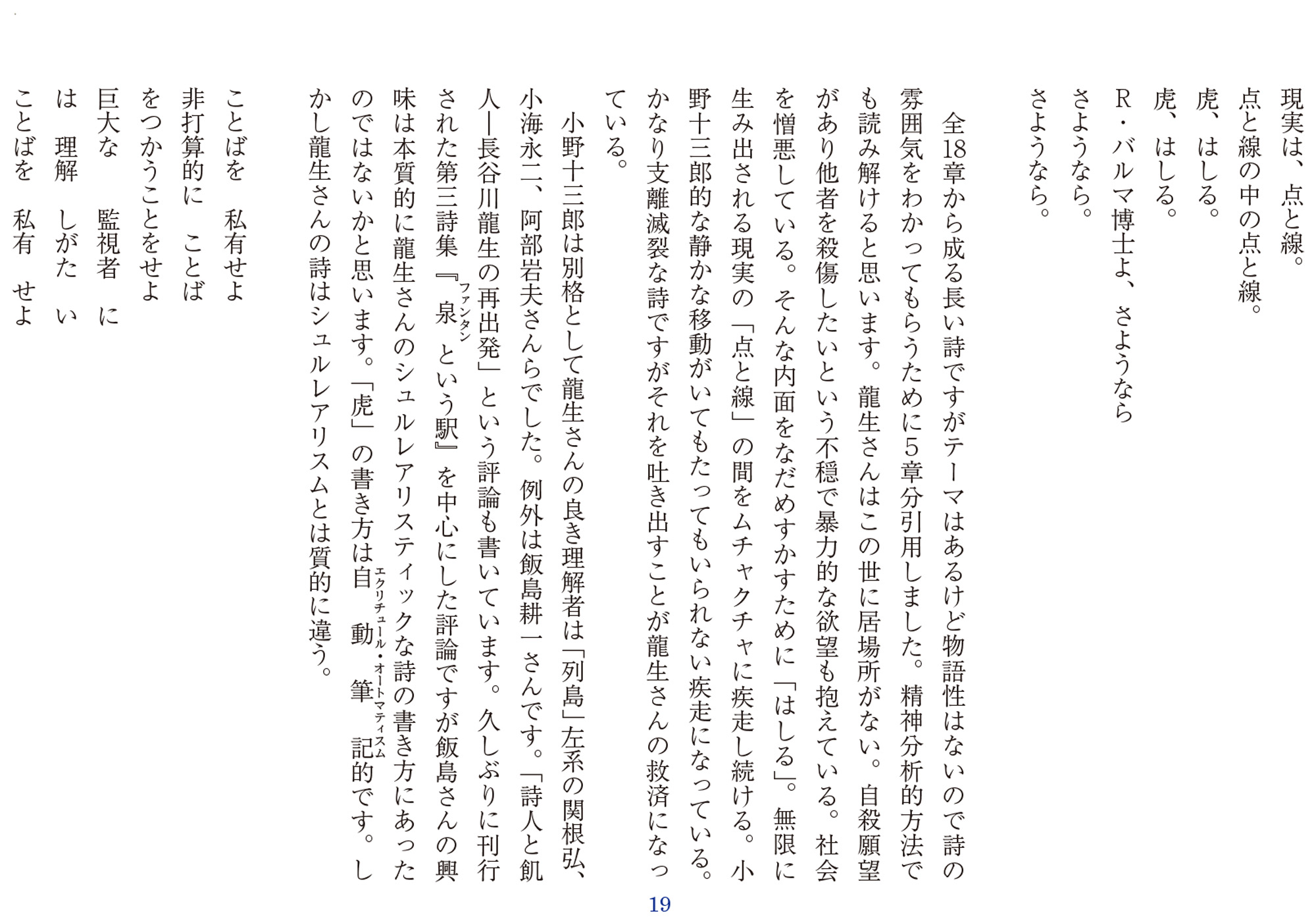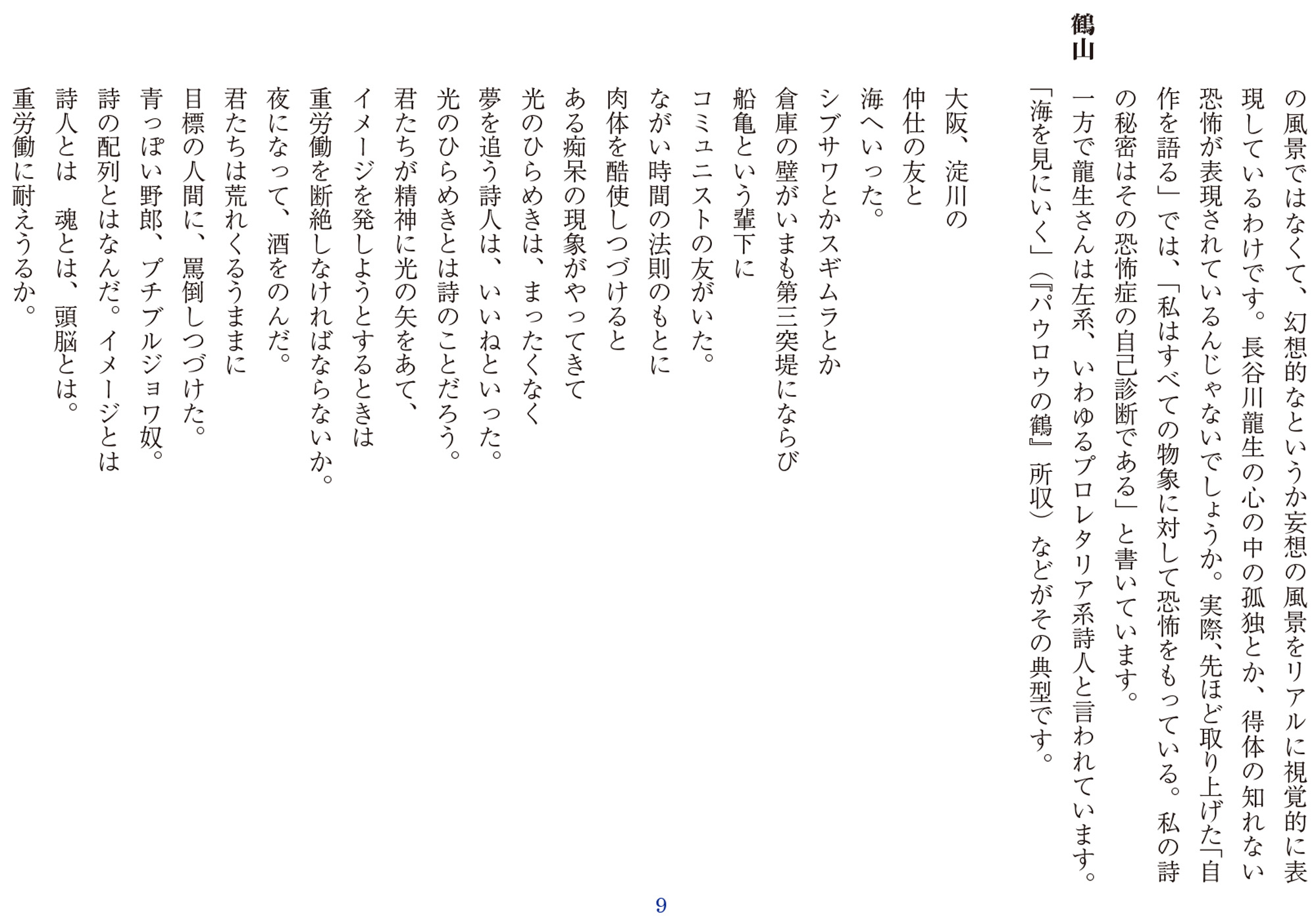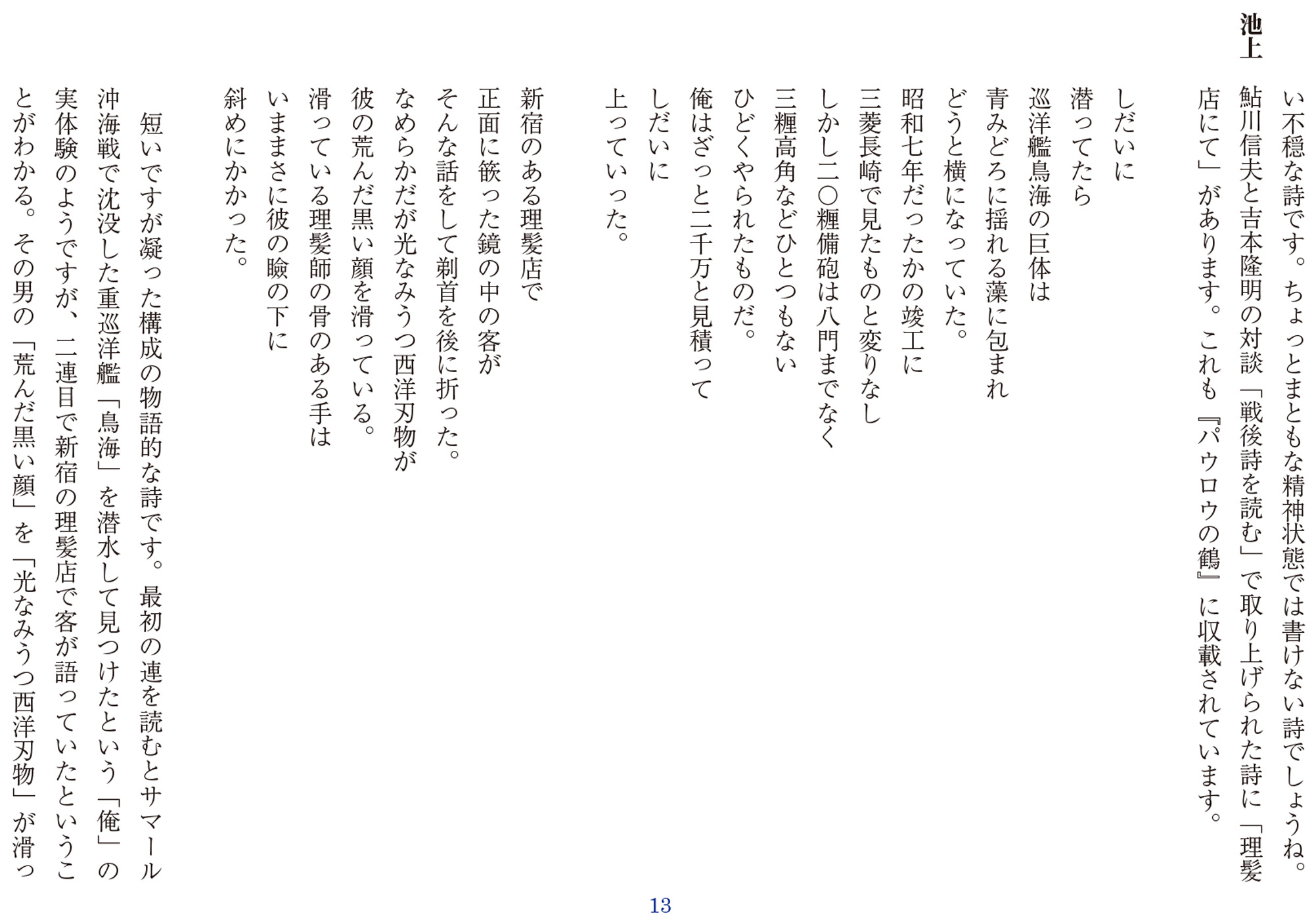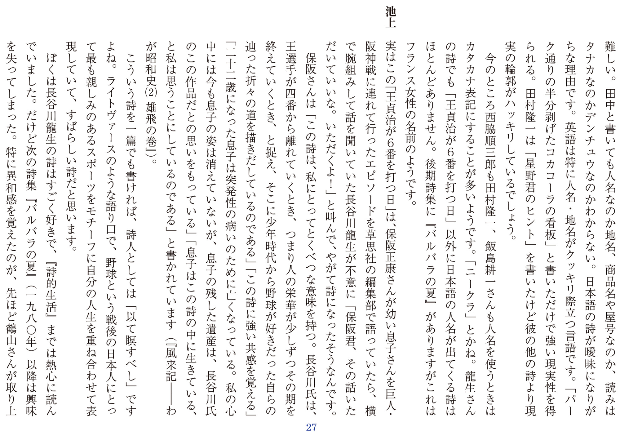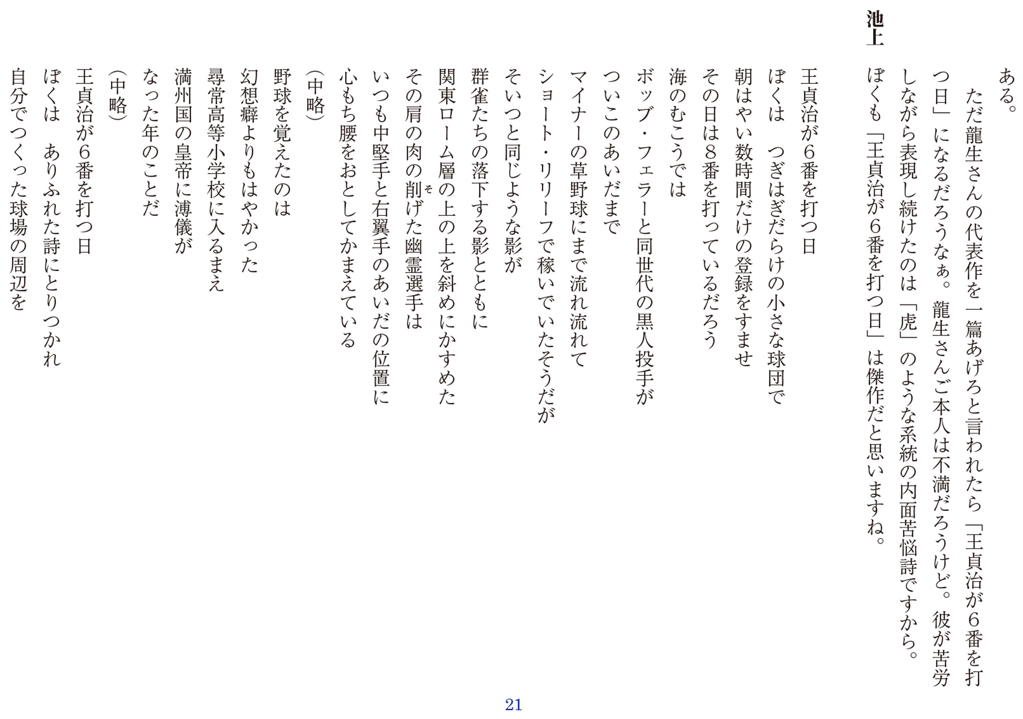 自由詩は現代詩以降の新たな詩のヴィジョンを見出せずに苦しんでいる。その大きな理由の一つは20世紀詩の2大潮流である戦後詩、現代詩の総括が十全に行われなかったことにある。21世紀自由詩の確実な基盤作りのために、池上晴之と鶴山裕司が自由詩という枠にとらわれず、詩表現の大局から一方の極である戦後詩を詩人ごとに詳細に読み解く。 by 金魚屋編集部 横書きでもお読みいただけます。左のボタンをクリックしてファイルを表示させてください。 *『対話 日本の詩の原理』は毎月01か02日にアップされます。 ■『ザ・バンド 来たるべきロック』池上晴之著 ■ ■鶴山裕司さんのコンテンツ■ 連作詩『聖遠耳 日日新』 連載詩論『現代詩人論』 連載『安井浩司研究』 連載評論『高柳重信とその時代』 連載エッセイ『言葉と骨董』 連載時評『美術展時評』 句誌時評 歌誌時評 ■ 金魚屋 BOOK SHOP ■ ■ 金魚屋 BOOK Café ■ No.024【対話 日本の詩の原理】『〝戦後の詩〟のアベレージ―小野十三郎/長谷川龍生/安東次男篇』(二 全三回)池上晴之×鶴山裕司【V】 was last modified: 11月 30th, 2025 by gold-fish-press 関連記事 No.024【... 対話『エンニス... 対話『エンニス... No.023【... No.023【... 対話『エンニス... 対話『エンニス... No.022【... No.022【... 対話『エンニス...