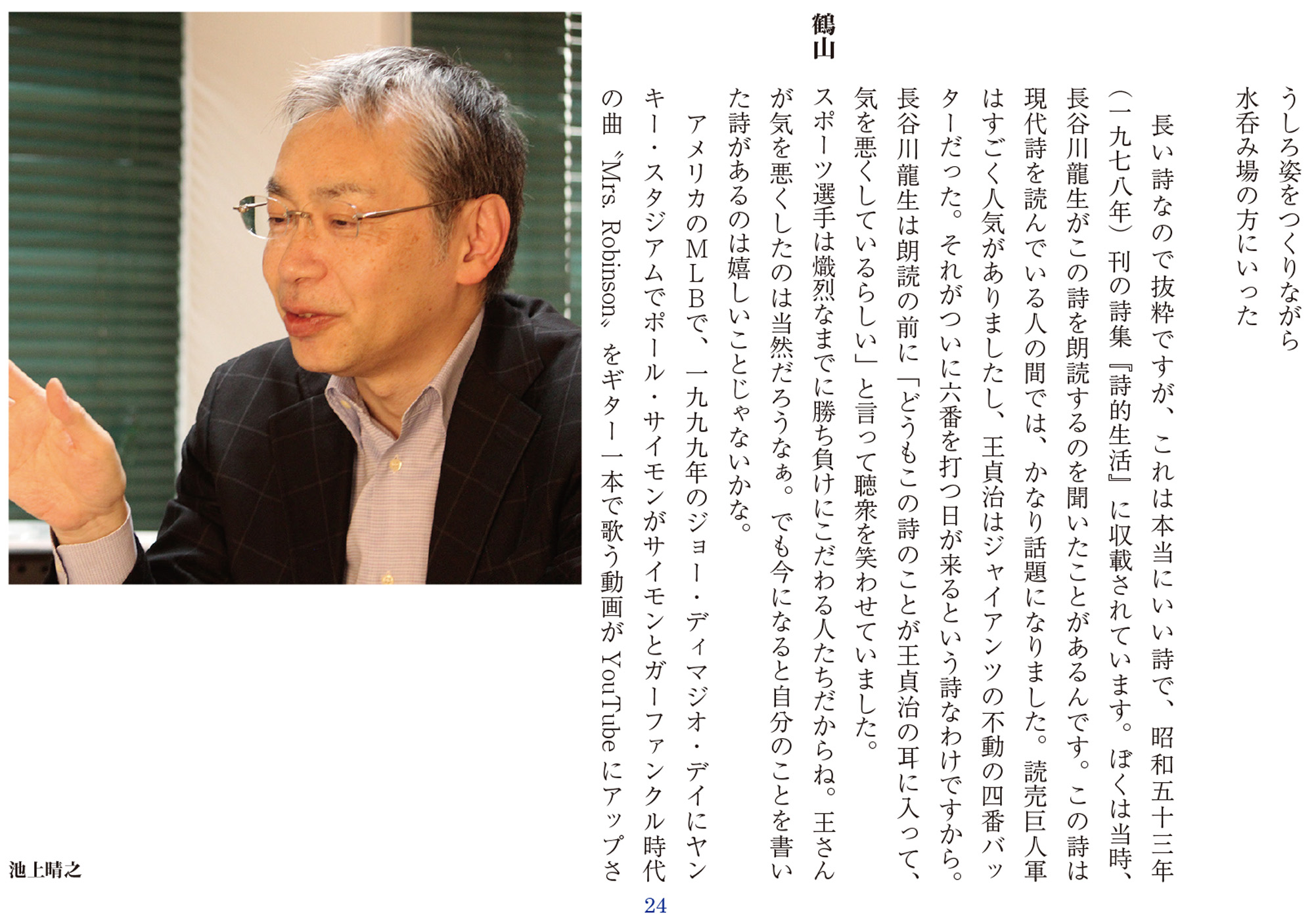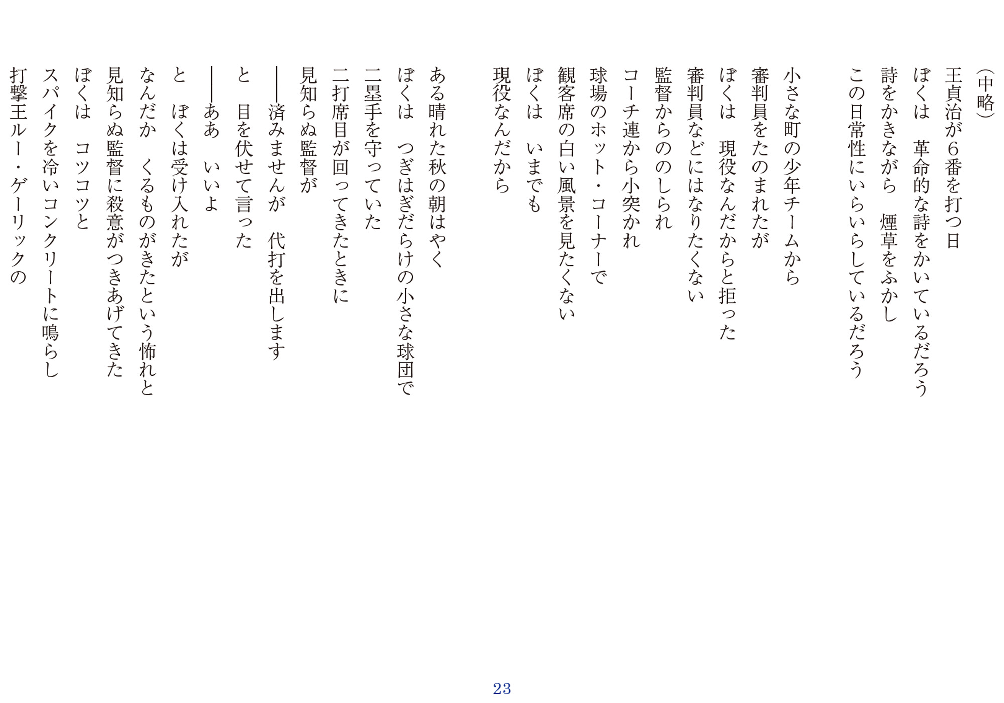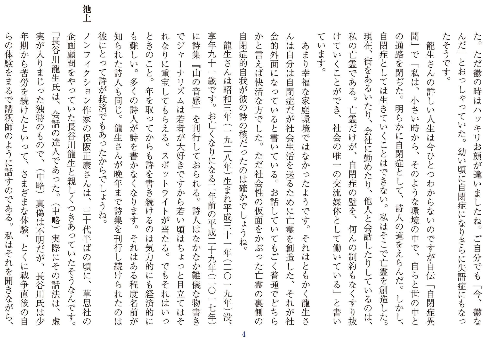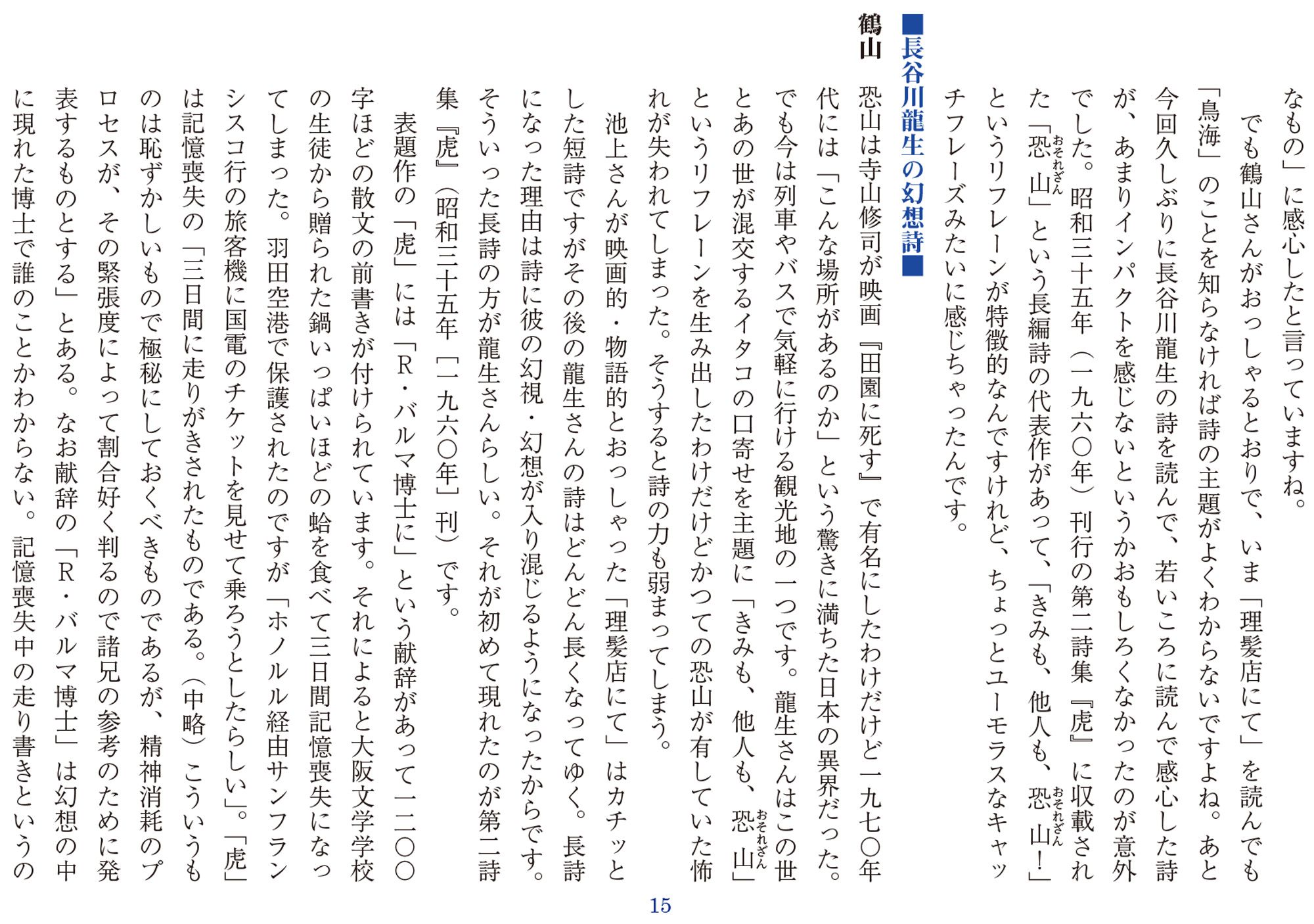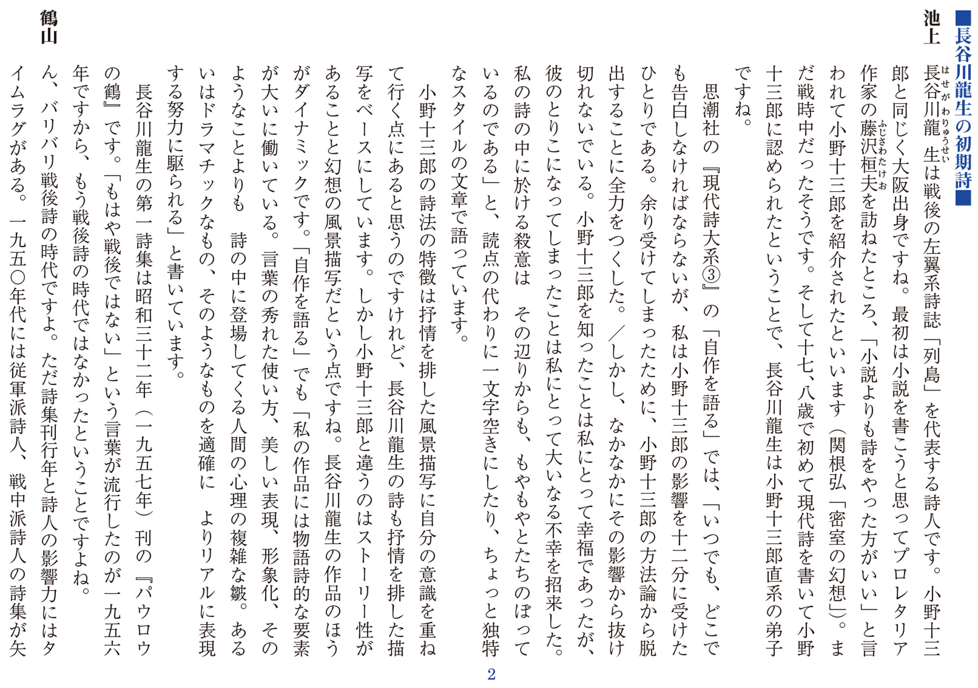自由詩は現代詩以降の新たな詩のヴィジョンを見出せずに苦しんでいる。その大きな理由の一つは20世紀詩の2大潮流である戦後詩、現代詩の総括が十全に行われなかったことにある。21世紀自由詩の確実な基盤作りのために、池上晴之と鶴山裕司が自由詩という枠にとらわれず、詩表現の大局から一方の極である戦後詩を詩人ごとに詳細に読み解く。 by 金魚屋編集部 横書きでもお読みいただけます。左のボタンをクリックしてファイルを表示させてください。 *『対話 日本の詩の原理』は毎月01か02日にアップされます。 ■『ザ・バンド 来たるべきロック』池上晴之著 ■ ■鶴山裕司さんのコンテンツ■ 連作詩『聖遠耳 日日新』 連載詩論『現代詩人論』 連載『安井浩司研究』 連載評論『高柳重信とその時代』 連載エッセイ『言葉と骨董』 連載時評『美術展時評』 句誌時評 歌誌時評 ■ 金魚屋 BOOK SHOP ■ ■ 金魚屋 BOOK Café ■ No.024【対話 日本の詩の原理】『〝戦後の詩〟のアベレージ―小野十三郎/長谷川龍生/安東次男篇』(二 全三回)池上晴之×鶴山裕司【V】 was last modified: 11月 30th, 2025 by gold-fish-press 関連記事 No.024【... 対話『エンニス... 対話『エンニス... No.023【... No.023【... 対話『エンニス... 対話『エンニス... No.022【... No.022【... 対話『エンニス...