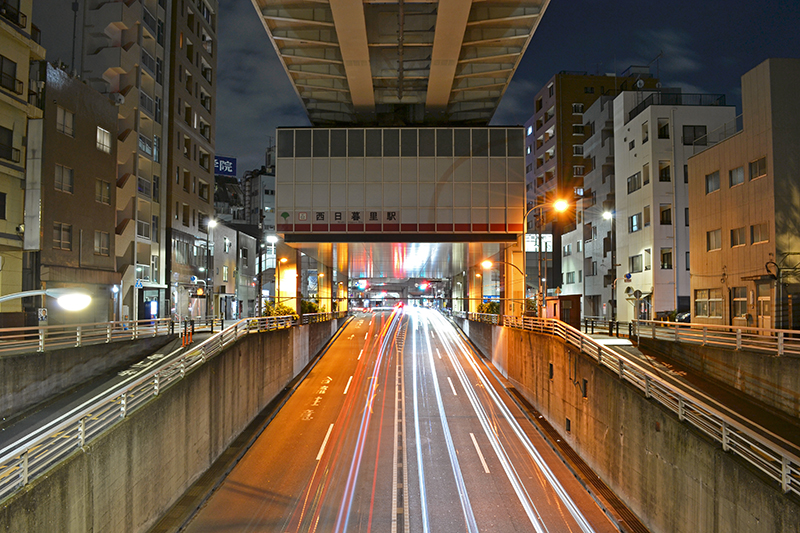 尾久橋通りの真上を走るモノレールで