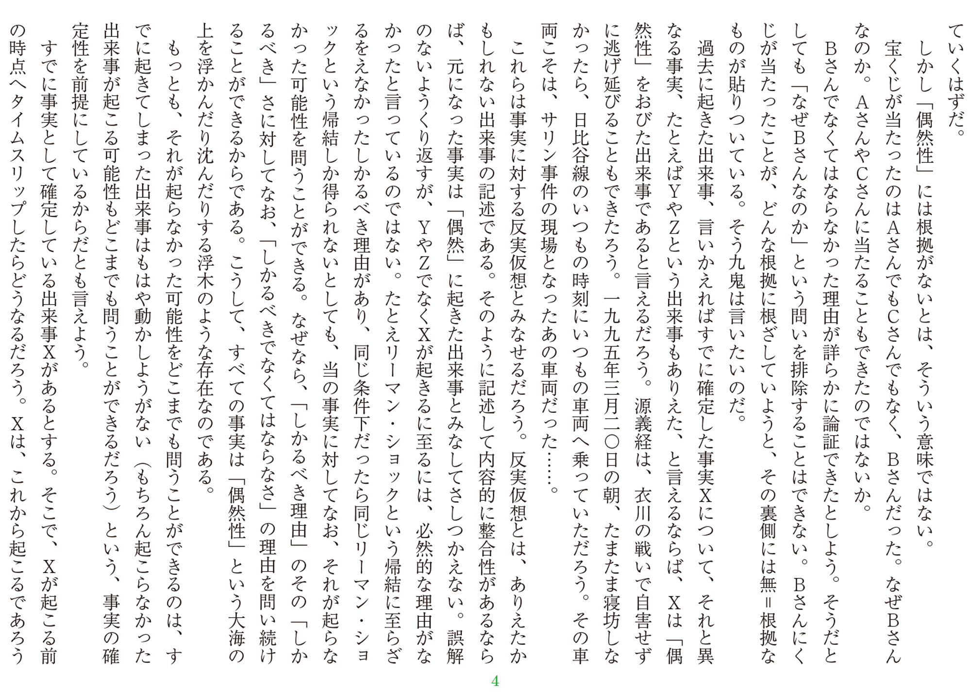 〝出来事〟はどうしようもなく、取り返しようもなく起こる。しかし緻密に分析していけば、それは〝偶然〟ではなく〝必然〟だったと考えることができる。だが本当にそうだろうか。〝出来事〟は〝偶然〟も必然〟も超えた決定的衝撃なのではあるまいか――〝「必然」と「偶然」、「此岸」と「彼岸」とが交わるパラドキシカルな時空〟ではないのか。自らの内に原罪を抱え、文学と哲学に救済を求める作家の新評論連載!