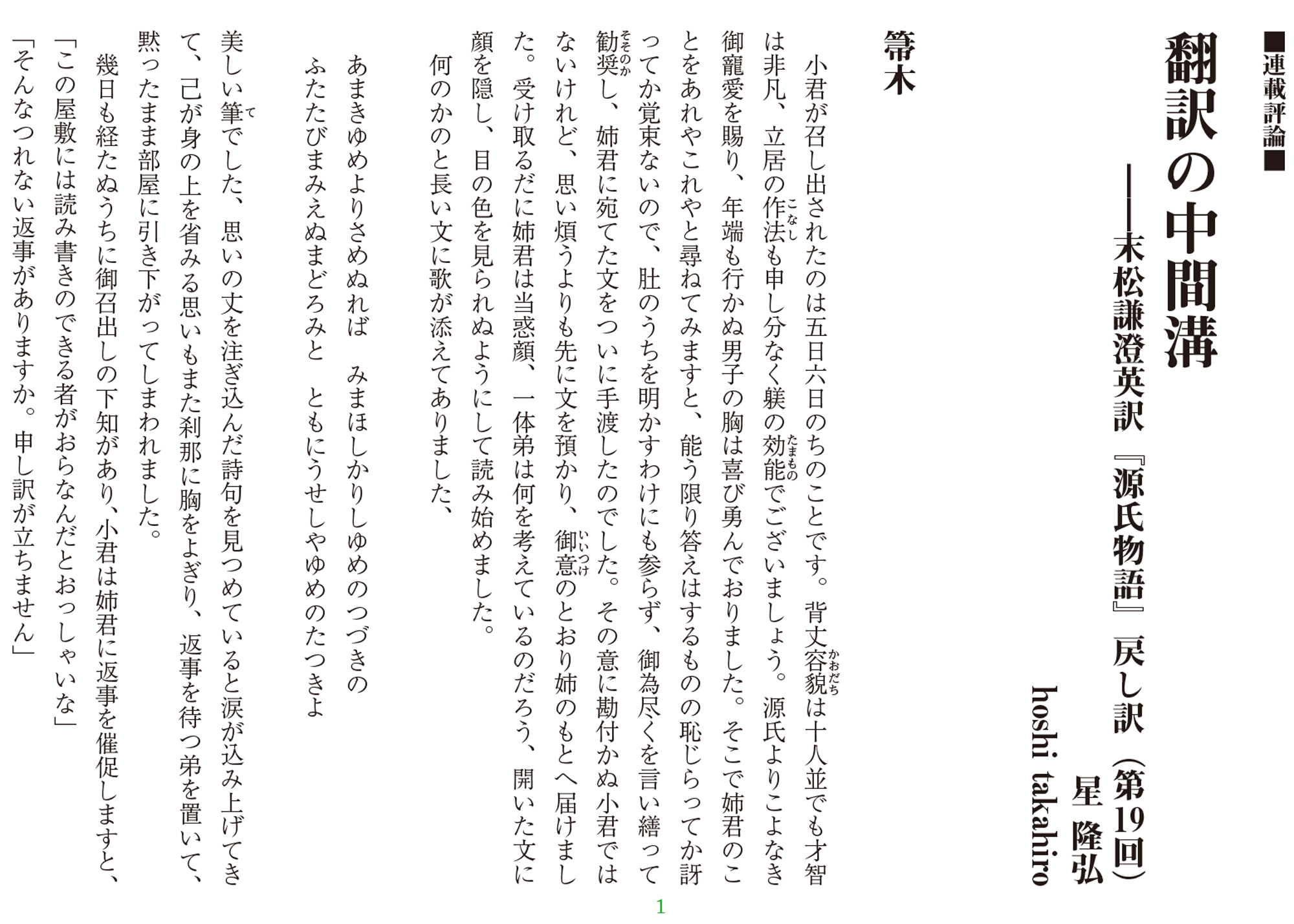 日本文学の古典中の古典、小説文学の不動の古典は紫式部の『源氏物語』。現在に至るまで欧米人による各種英訳が出版されているが、世界初の英訳は明治15年(1882年)刊の日本人・末松謙澄の手によるもの。欧米文化が怒濤のように流入していた時代に末松はどのような翻訳を行ったのか。気鋭の英文学者・星隆弘が、末松版『源氏物語』英訳の戻し訳によって当時の文化状況と日本文学と英語文化の差異に迫る! by 金魚屋編集部 横書きでもお読みいただけます。左のボタンをクリックしてファイルを表示させてください。 ■ 金魚屋 BOOK SHOP ■ ■ 金魚屋 BOOK Café ■ 星隆弘 連載評論『翻訳の中間溝――末松謙澄英訳『源氏物語』戻し訳』(第19回)【V】 was last modified: 12月 11th, 2025 by gold-fish-press 関連記事 星隆弘 連載評... 萩野篤人 連載... 萩野篤人 連載... 萩野篤人 新連... 萩野篤人 新連... 萩野篤人 書評... 星隆弘 連載評... 星隆弘 連載評... 萩野篤人 連載... 萩野篤人 連載...