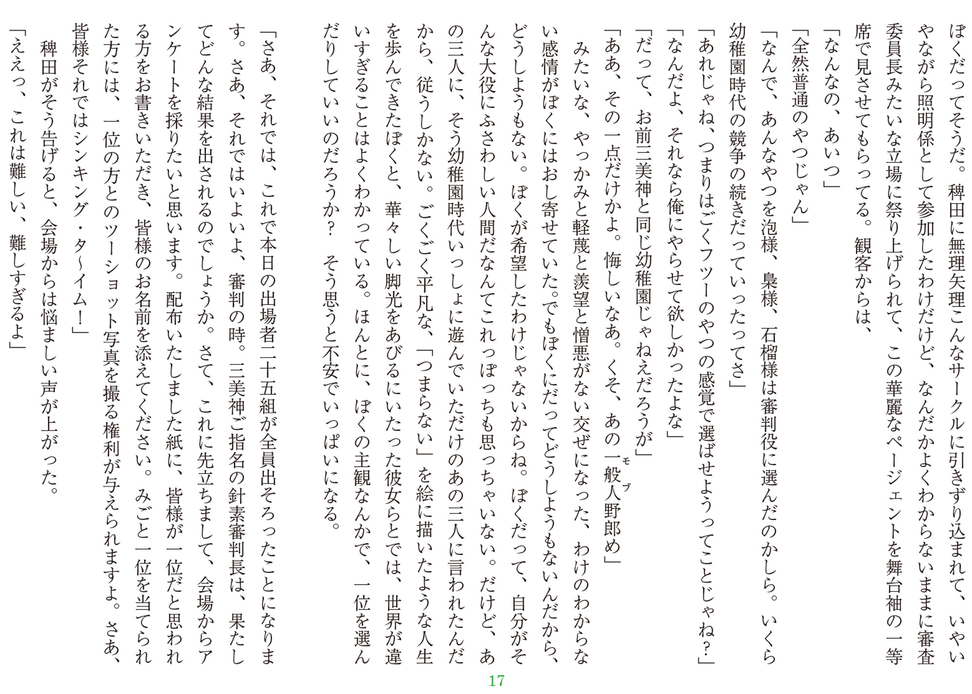 学園祭のビューティーコンテストがフェミニスト女子学生たちによって占拠された。しかしアイドル女子学生3人によってビューティーコンテストがさらにジャックされてしまう。彼女たちは宣言した。「あらゆる制限を取り払って真の美を競い合う〝ビューチーコンテストオ!〟を開催します!」と。審判に指名されたのは地味で目立たない僕。真の美とは何か、それをジャッジすることなどできるのだろうか・・・。