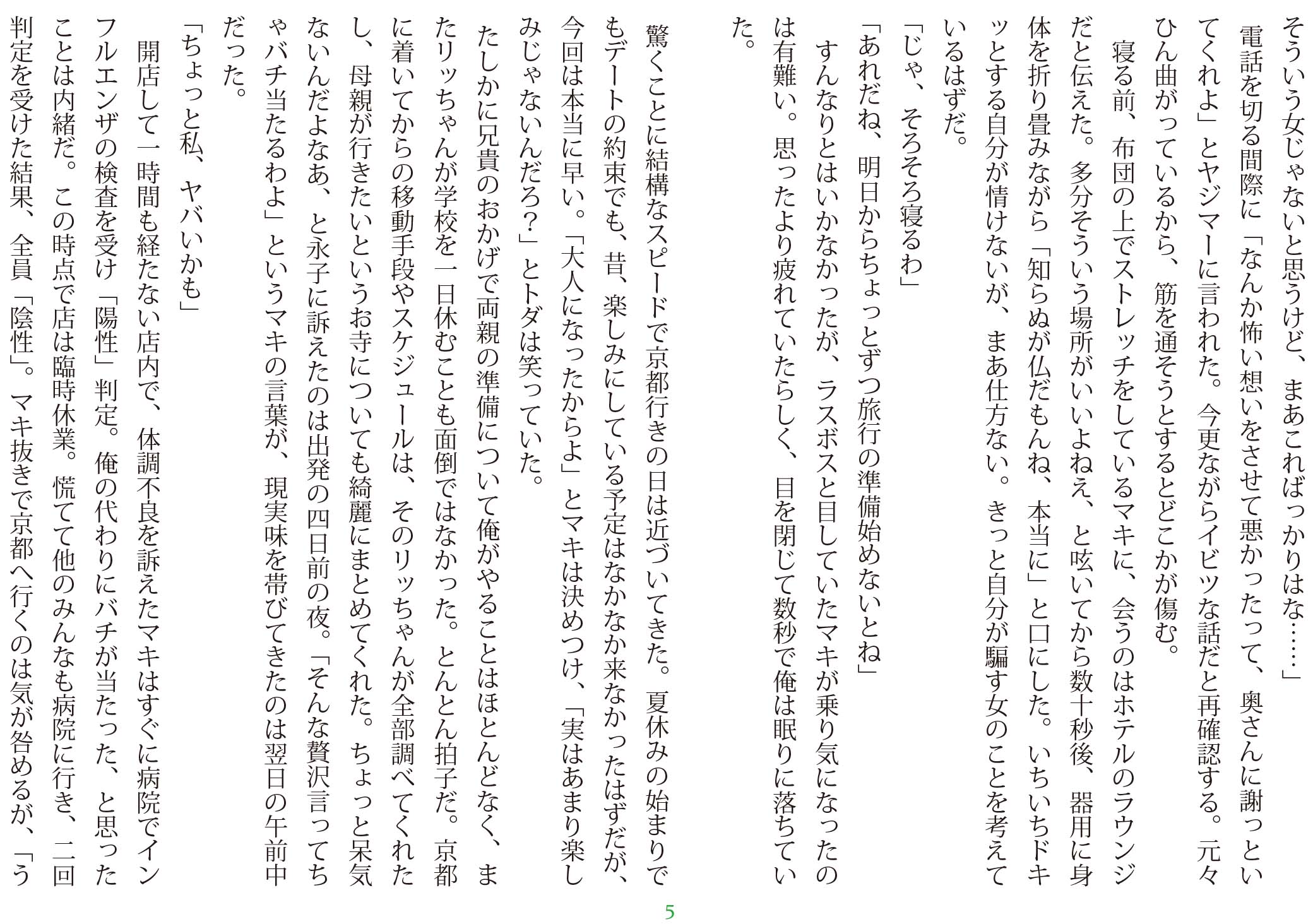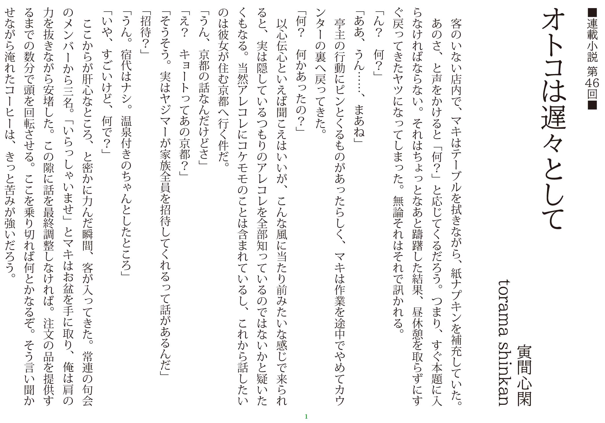 妻が妊娠した。夫の方には、男の方にはさしたる驚きも感慨もない。ただ人生の重大事であり岐路にさしかかっているのも確か。さて、男はどうすればいいのか? どう振る舞えばいいのか、自分は変化のない日常をどう続ければいいのか? ・・・。辻原登奨励小説賞受賞作家寅間心閑の連載小説第5弾!。 by 金魚屋編集部 横書きでもお読みいただけます。左のボタンをクリックしてファイルを表示させてください。 *『オトコは遅々として』は毎月07日にアップされます。 ■ 金魚屋 BOOK SHOP ■ ■ 金魚屋 BOOK Café ■ 寅間心閑 連載小説『オトコは遅々として』(第48回)【V】 was last modified: 1月 6th, 2026 by 寅間心閑 関連記事 寅間心閑 連載... 遠藤徹 連載小... 遠藤徹 連載小... 寅間心閑 連載... 寅間心閑 連載... “... “... 遠藤徹 連載小... 遠藤徹 連載小... 寅間心閑 連載...