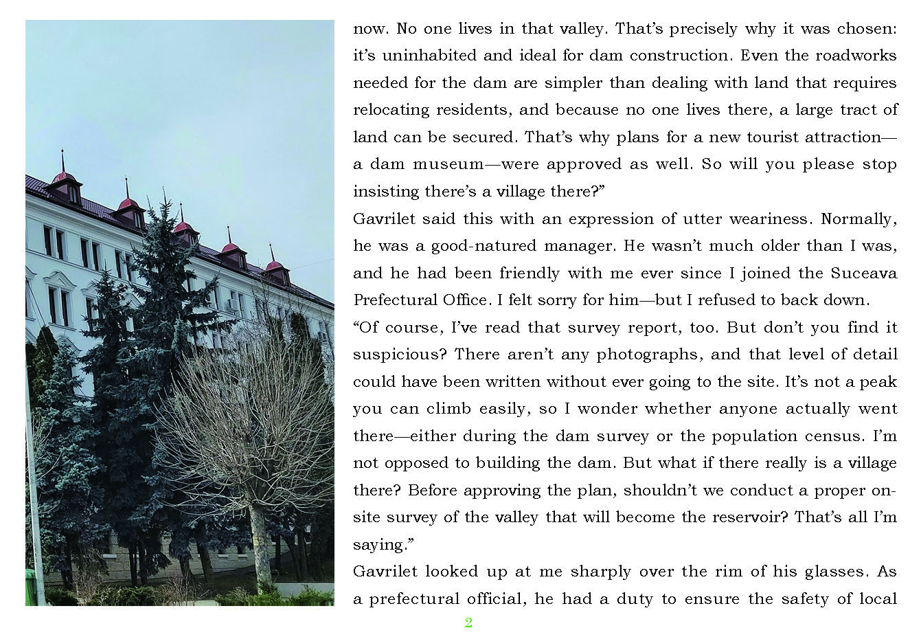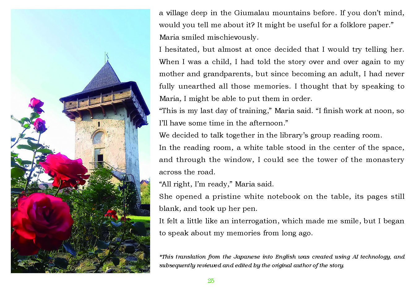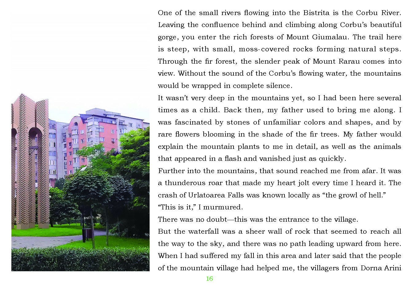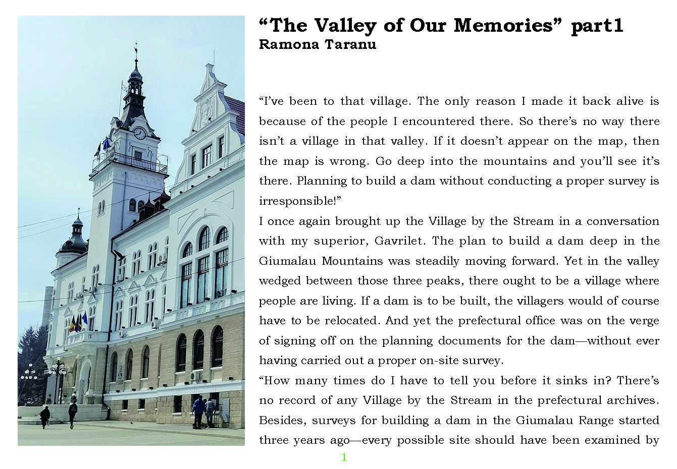 It has been decided to build a dam deep in the Giumalau Mountains in Romania. If the dam is built, a village deep in the mountains will be submerged. There must be a village there that is not on any map and is unknown to the locals. Andrei, who works for the Suceava Prefectural Office, sets out alone to investigate the existence of the village, which he had visited only once 20 years ago before construction of the dam began…. A fantasy novel by Ramona Tsaraneu, a Romanian Noh researcher and translator.