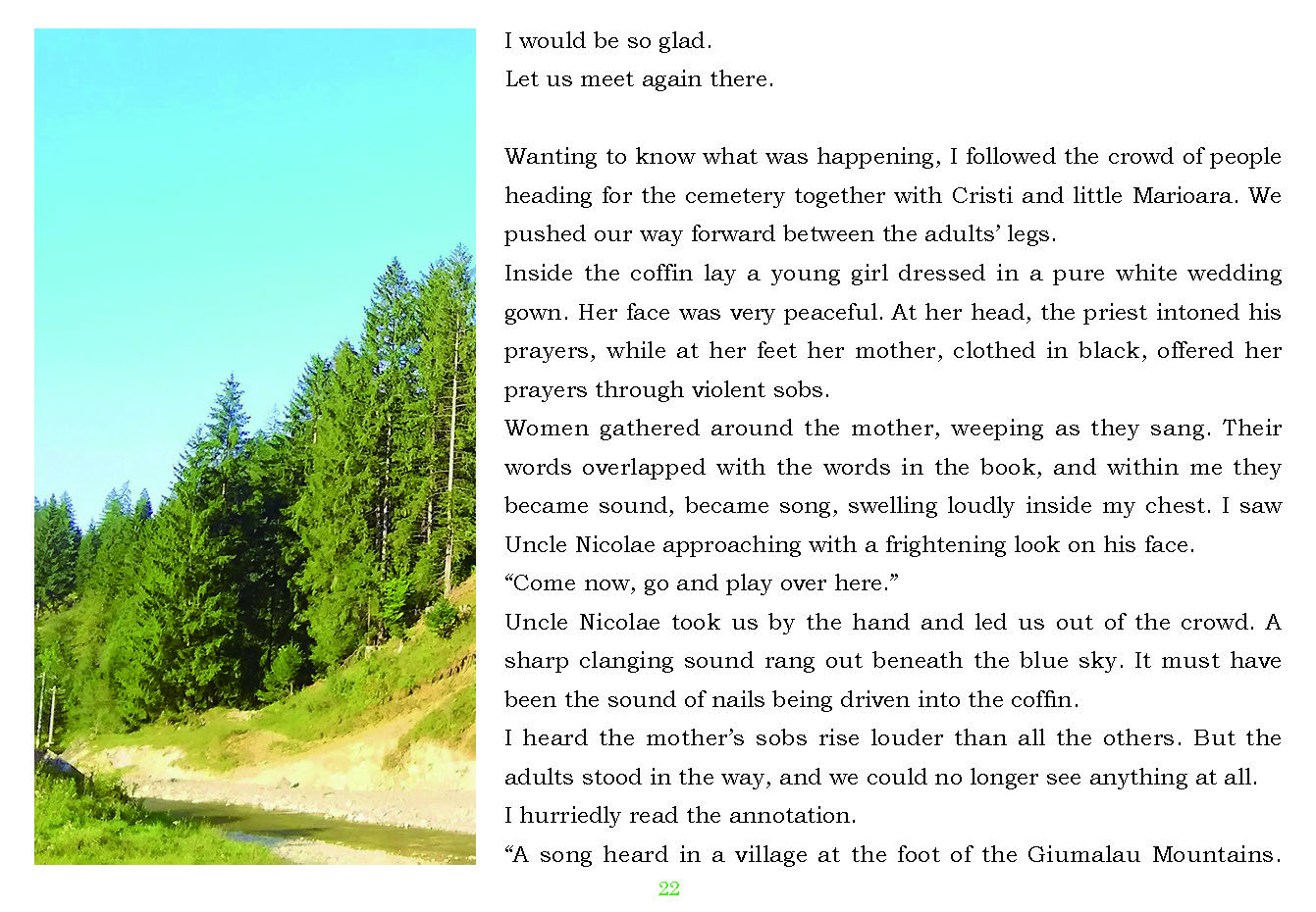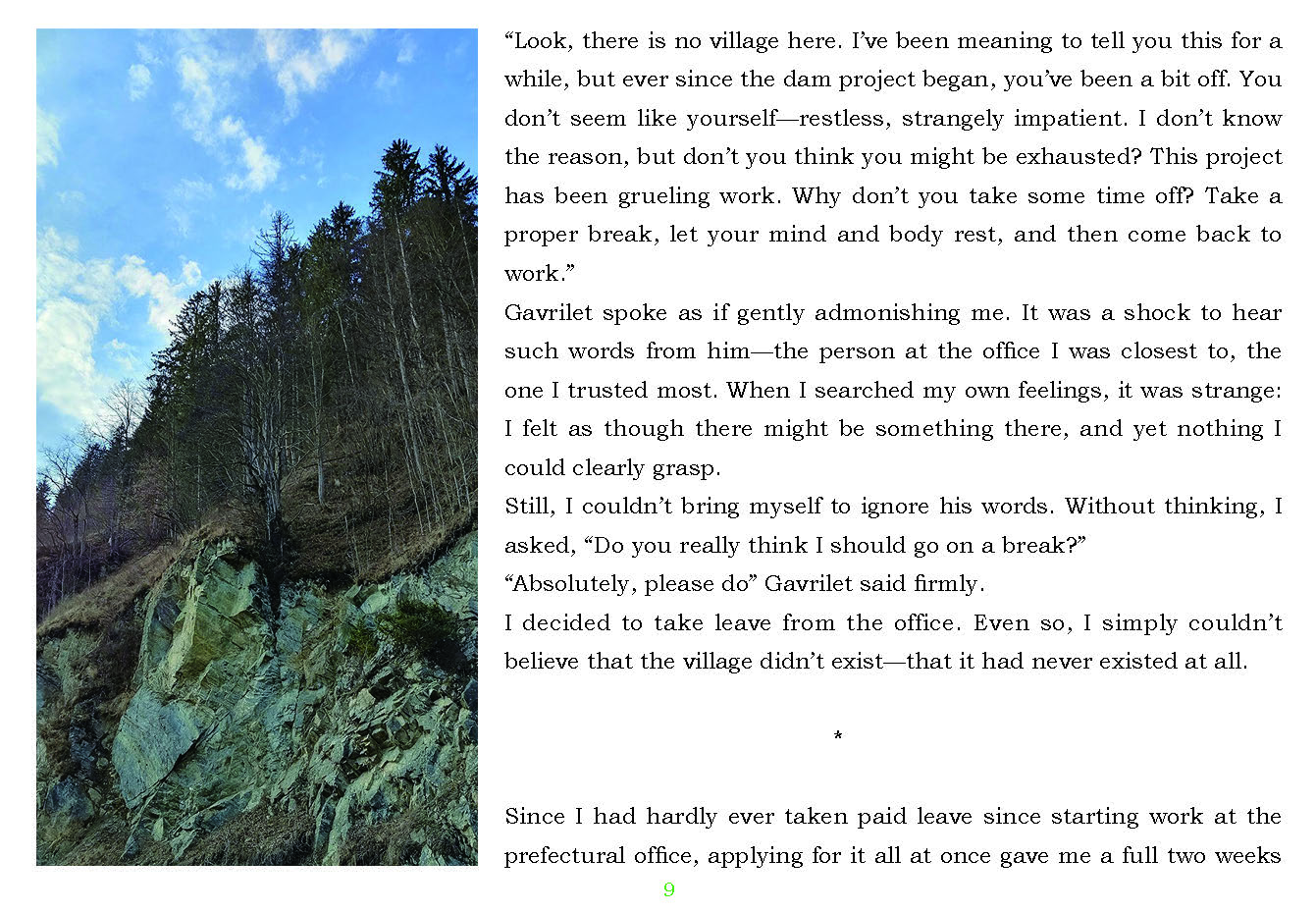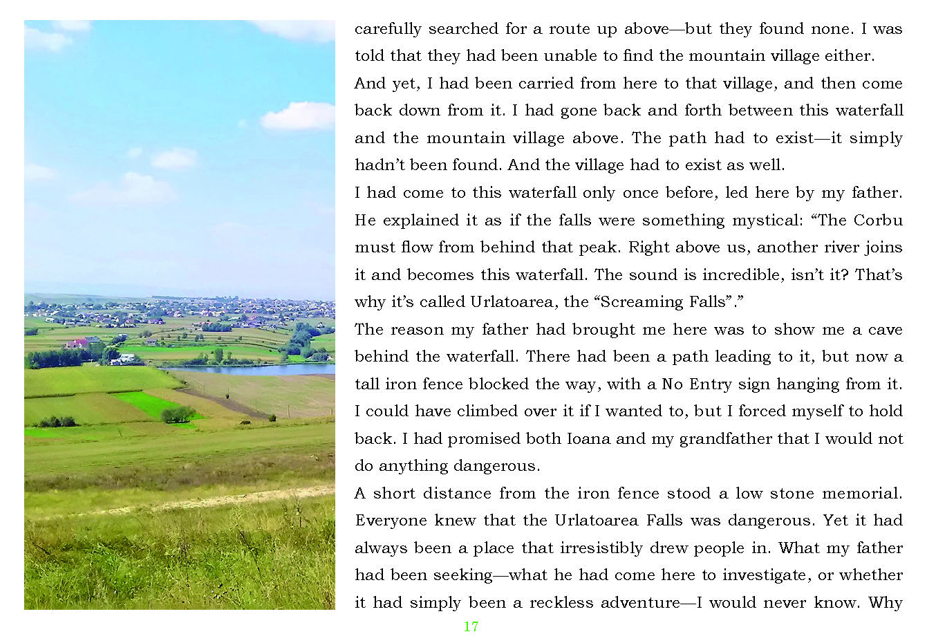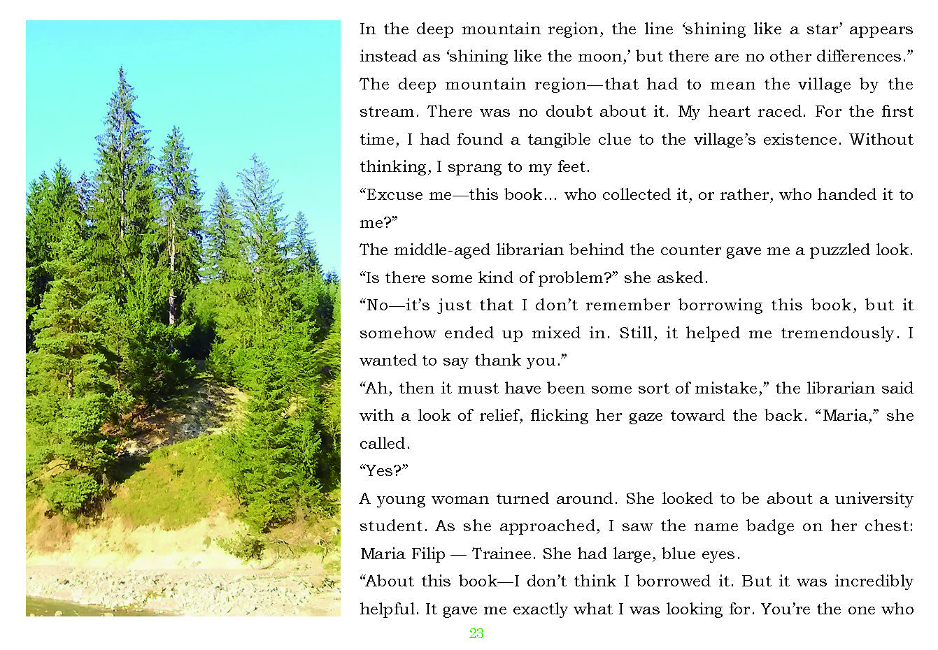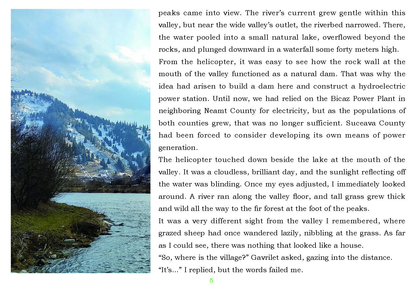 It has been decided to build a dam deep in the Giumalau Mountains in Romania. If the dam is built, a village deep in the mountains will be submerged. There must be a village there that is not on any map and is unknown to the locals. Andrei, who works for the Suceava Prefectural Office, sets out alone to investigate the existence of the village, which he had visited only once 20 years ago before construction of the dam began…. A fantasy novel by Ramona Tsaraneu, a Romanian Noh researcher and translator.