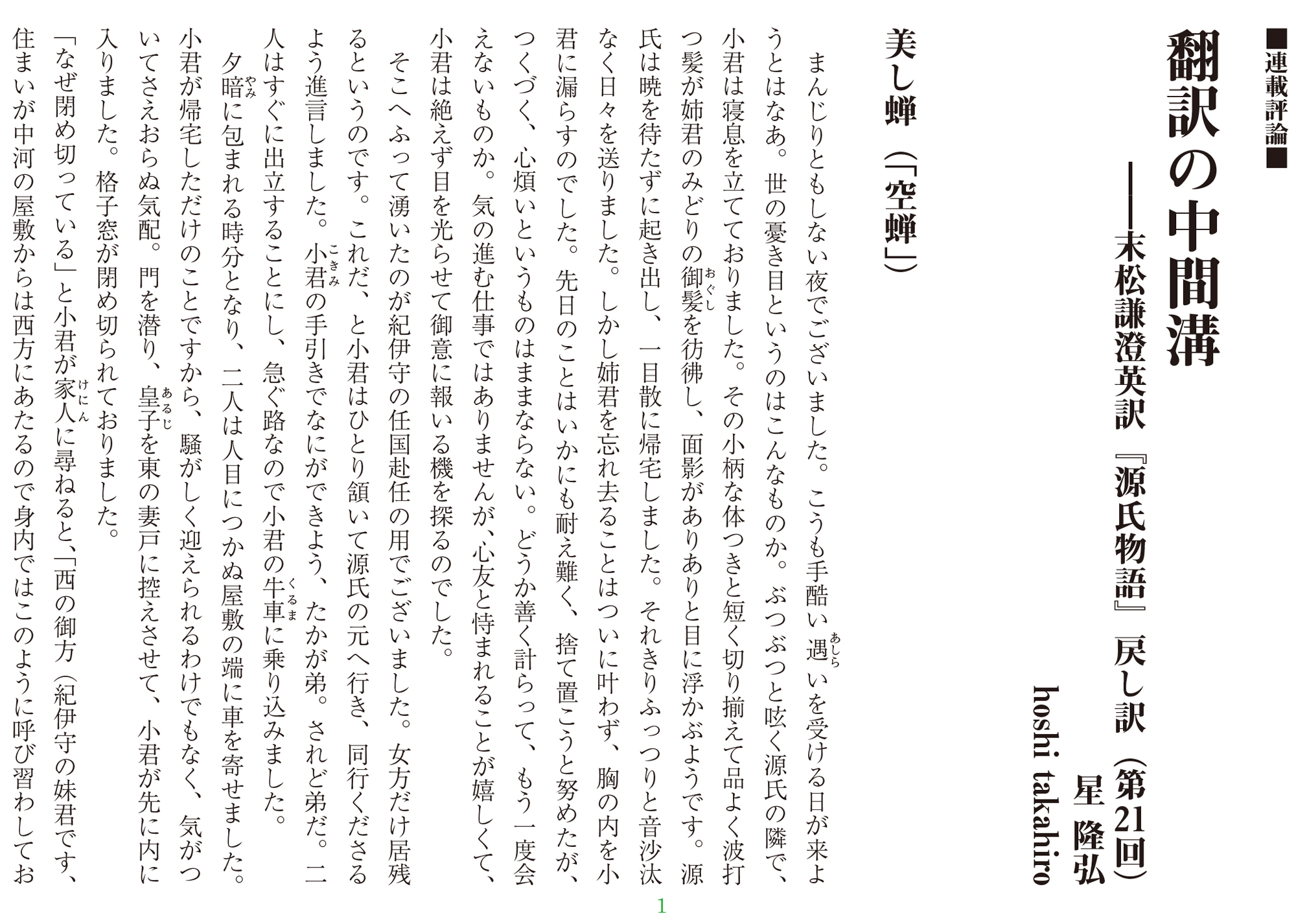 日本文学の古典中の古典、小説文学の不動の古典は紫式部の『源氏物語』。現在に至るまで欧米人による各種英訳が出版されているが、世界初の英訳は明治15年(1882年)刊の日本人・末松謙澄の手によるもの。欧米文化が怒濤のように流入していた時代に末松はどのような翻訳を行ったのか。気鋭の英文学者・星隆弘が、末松版『源氏物語』英訳の戻し訳によって当時の文化状況と日本文学と英語文化の差異に迫る! by 金魚屋編集部 横書きでもお読みいただけます。左のボタンをクリックしてファイルを表示させてください。 ■ 金魚屋 BOOK SHOP ■ ■ 金魚屋 BOOK Café ■ 星隆弘 連載評論『翻訳の中間溝――末松謙澄英訳『源氏物語』戻し訳』(第21回)【V】 was last modified: 2月 11th, 2026 by 星隆弘 関連記事 星隆弘 連載評... 文芸誌でお茶を... 萩野篤人 連載... 萩野篤人 連載... 文芸誌でお茶を... 星隆弘 連載評... 星隆弘 連載評... 萩野篤人 連載... 萩野篤人 連載... 星隆弘 連載評...